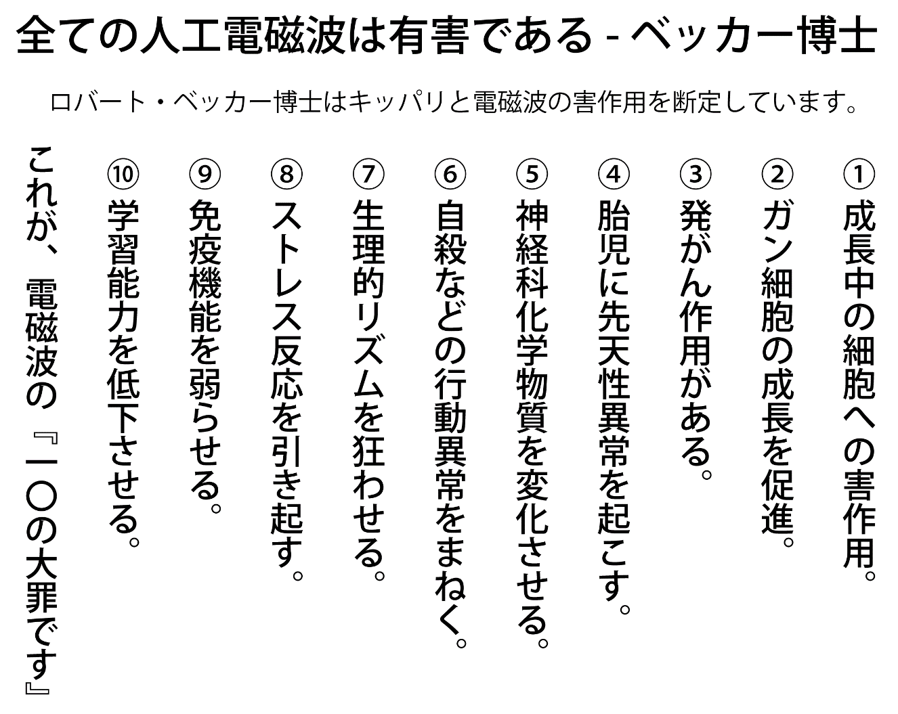 電磁波障害の第一人者であるロバート・ベッカー博士は全ての人口電磁波は有害であると断定しています。そしてその有害な作用を10に分けて、電磁波の10の大罪として発表しています。
