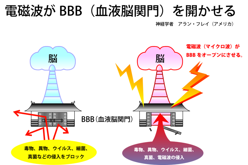 これによって、脳内に有害物質が入らないようにしているのですが、電磁波にさらされるとBBBが正常に働かなくなり、脳内に有害物質が混入してしまいます。