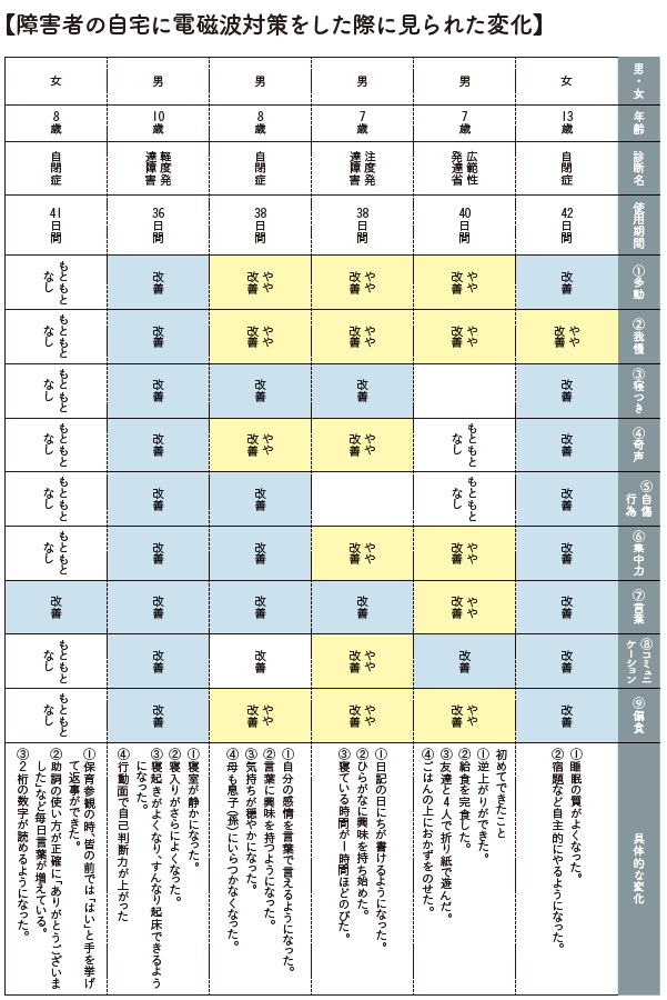 下表は6人の障害者の改善点を示した表です。この試みの結果から考えると、電気コンセントやブレーカーからの電磁波は、子どもの脳にマイナスの影響を与えていたといえそうです。