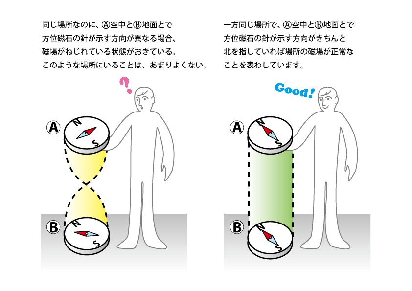 これまで方位磁石が正しい方位を指す場所や、正しい方位を指さない場所で、人体がどうなるかについて大ざっぱに説明してきました。では一体、方位磁石が正しい方位を指すということは、どういったことを意味するのでしょうか。 方位磁石は、地球が発する微弱な磁気(地磁気という)に反応して動きます。具体的には、針の赤い部分が地球の北、北極方向を指し、針の赤くない部分が地球の南、南極の方を指します。方位磁石が正しい方位を指すということは、その場所では地磁気が正常に働いているということを意味します。一方、方位磁石が正しい方位を指さないということは、その場所では地磁気より強い磁気が働いているということを意味します。たとえば電気を使うと発生する人工的な磁場があると、方位磁石が正しい方位を指しません。