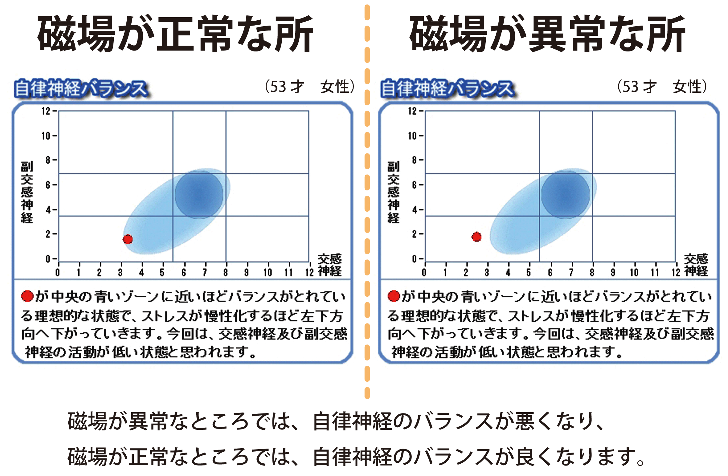 方位磁石が狂う場所で筋力や柔軟性を測ると、明らかに筋力も柔軟性も低下します(悪いことです)。ところが、方位磁石が正しく北を指し示す場所では、筋力も柔軟性も明らかに上昇します(良いことです)。それだけでなく、方位磁石が狂う場所では脳の前頭前野の血流が下がり、方位磁石が正しい方向を指す場所では、脳の前頭前野の血流が上がるのです。さらに、自律神経系の計測でも、同じような結果が得られています。方位磁石が狂う場所では自律神経が失調し、方位磁石が正しい方位を指す場所では自律神経が正常に働くのです。 これらのことから言えることは、方位磁石が狂う場所では、脳の機能が低下し、自律神経も失調するため、免疫力が極端に下がるということです。免疫力が下がると癌をはじめ、様々な病気になりやすくなるのは当たり前のことなのです。