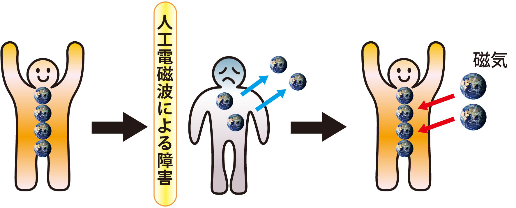 寝ているときは別ですが人は始終動き回るため、つねに地磁気を十分に受け取ることのできる正常磁場にいることはできません。それなら地磁気と同じ微弱な磁気を発生するものを身に着けたり、地磁気を発するものの上に立ったり座ったりしてはどうでしょうか。