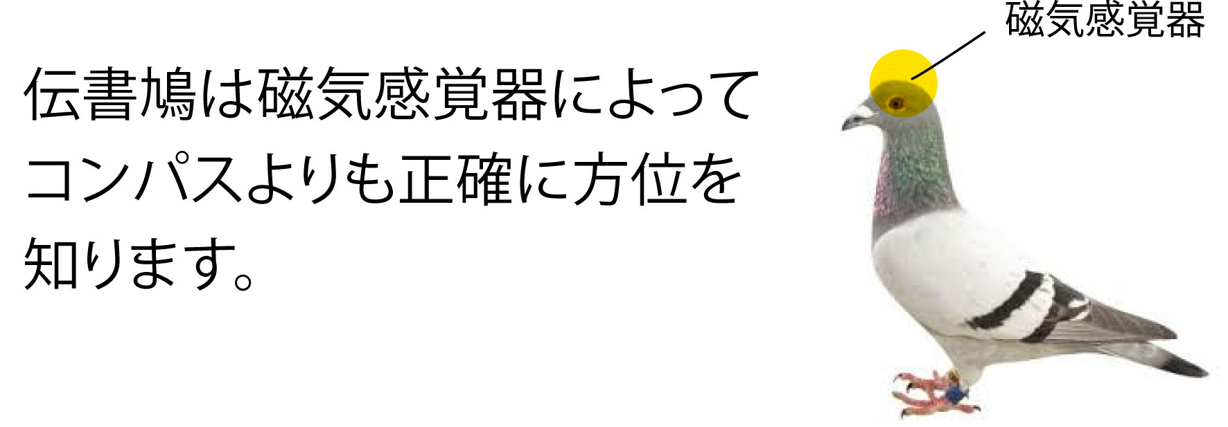 また、伝書鳩は地磁気の磁場から方角に関する情報を引き出す生物的なコンパスを持っていると言われています。ハトの脳内にも磁性結晶があり、それが脳とつながり、ハトに地磁気の磁場の正確な方角を知らせていたのです。