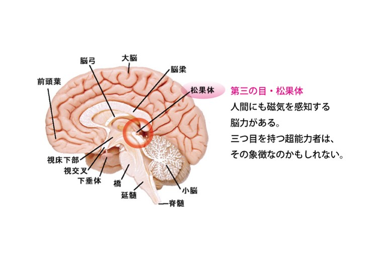 人には地磁気を感知するもう一つの器官があります。それは、松果体という器官です。松果体とは、ちょうど頭の中心部にある小さな松かさ状の形をした内分泌器官(ホルモンを出す器官を内分泌器官といいます。)です。松果体が脳下垂体からの成長ホルモンを分泌させます。脳下垂体よりも上位の内分泌器官ということで、内分泌器官の王様と呼ばれています。松果体は磁気感覚を持ち、毎日の地磁気の周期パターンを感受し、全身の内分泌ホルモンをコントロールしています。