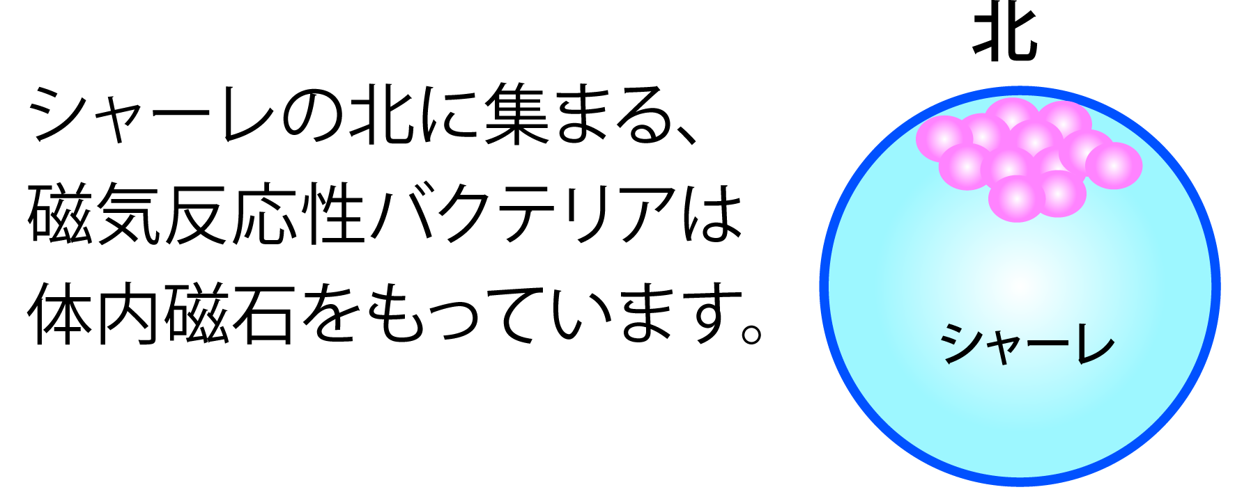 バクテリアの中には、培養皿の中で、培養すると常に培養皿の北側に群れ集まる習性をもつものがいます。これを磁気反応性バクテリアといいます。この磁気反応性バクテリアを電子顕微鏡で観察してみると、バクテリアの体内に微細な磁石の鎖がみつかりました。しかもその磁石は天然の磁鉄鉱の結晶そのものでありました。
