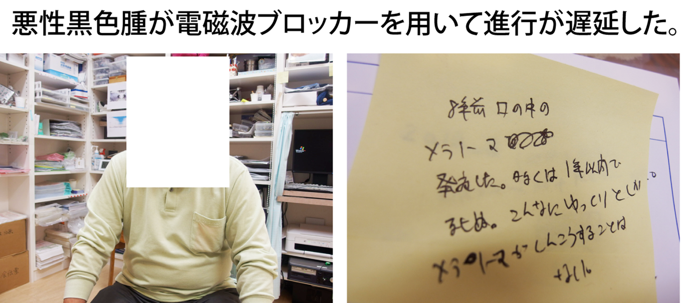 60代の男性は8年前に口の中に悪性黒色腫(メラノーマ)ができました。手術や抗癌剤、放射線治療までしたが、進行しているので何とかならないかといって来られました。この時点で、余命1年と言われましたが、自宅の電気コンセントやブレーカーの電磁波対策をしてもらい、抗癌漢方を服用してもらったところ、8年経った今も当院に通院しておられます。悪性黒色腫は、電磁波が原因の一つと思われます。