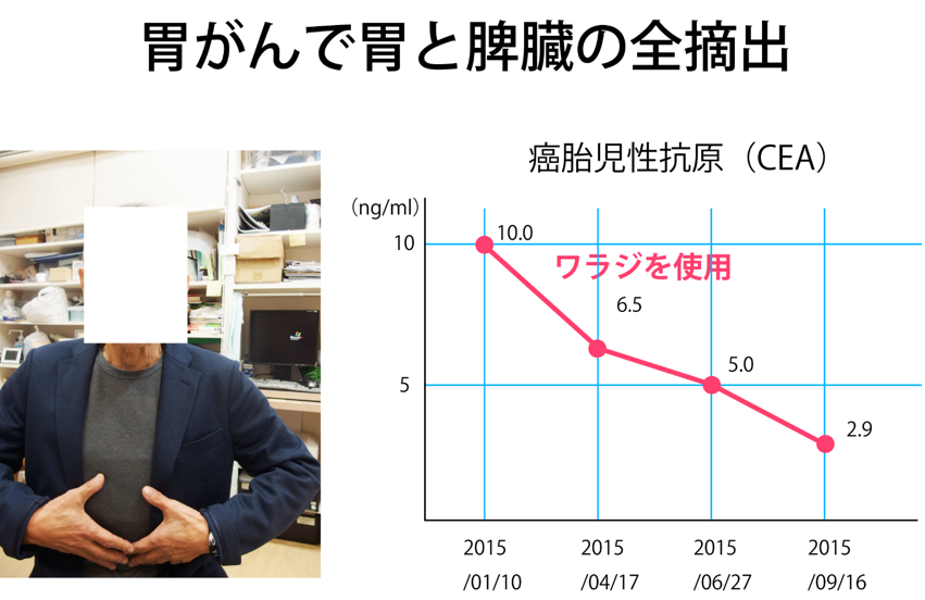 70代の男性が胃癌の手術をしたが、そのあと腫瘍マーカーが下がらず困っているということで来院されました。自宅の電磁波対策をしてもらった後、生体磁気と生体電気を人体に供給する機械(ワラジ)をほぼ2日に1回1時間の頻度で患部にあてると、腫瘍マーカーの癌胎児性抗原(CEA)が下がりはじめ、体調がすこぶる良くなりました。このケースからも電磁波が病の原因又は悪化因子の一つだということが言えそうです。