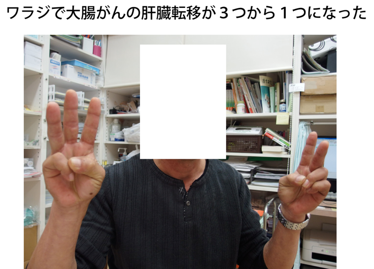 61歳の大腸癌の男性は、肝臓は転移巣だらけで、服の上から見ても腫れているのがわかります。特に、右胸内の転移巣は大きく、少し動いただけでも痛みます。病院で治療したくないと言うので、生体電気と生体磁気を補うワラジという機械を肝臓の転移で腫れている部分にあててみました。2週間あてたところで、転移で腫れている部分は明らかに縮小し、痛みも消えてしまいました。大腸癌は治ったわけではありませんが、大腸癌の部分にもワラジをあててもらうことにしました。