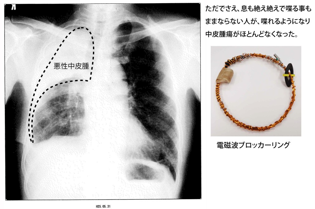 この方の悪性中皮腫は、電磁波ブロッカーリングを患部につけただけで、あとは抗癌剤も放射線治療も受けずに軽快していきました。その経過から、悪性中皮腫の原因の一部に電磁波による障害があったと考えられます。