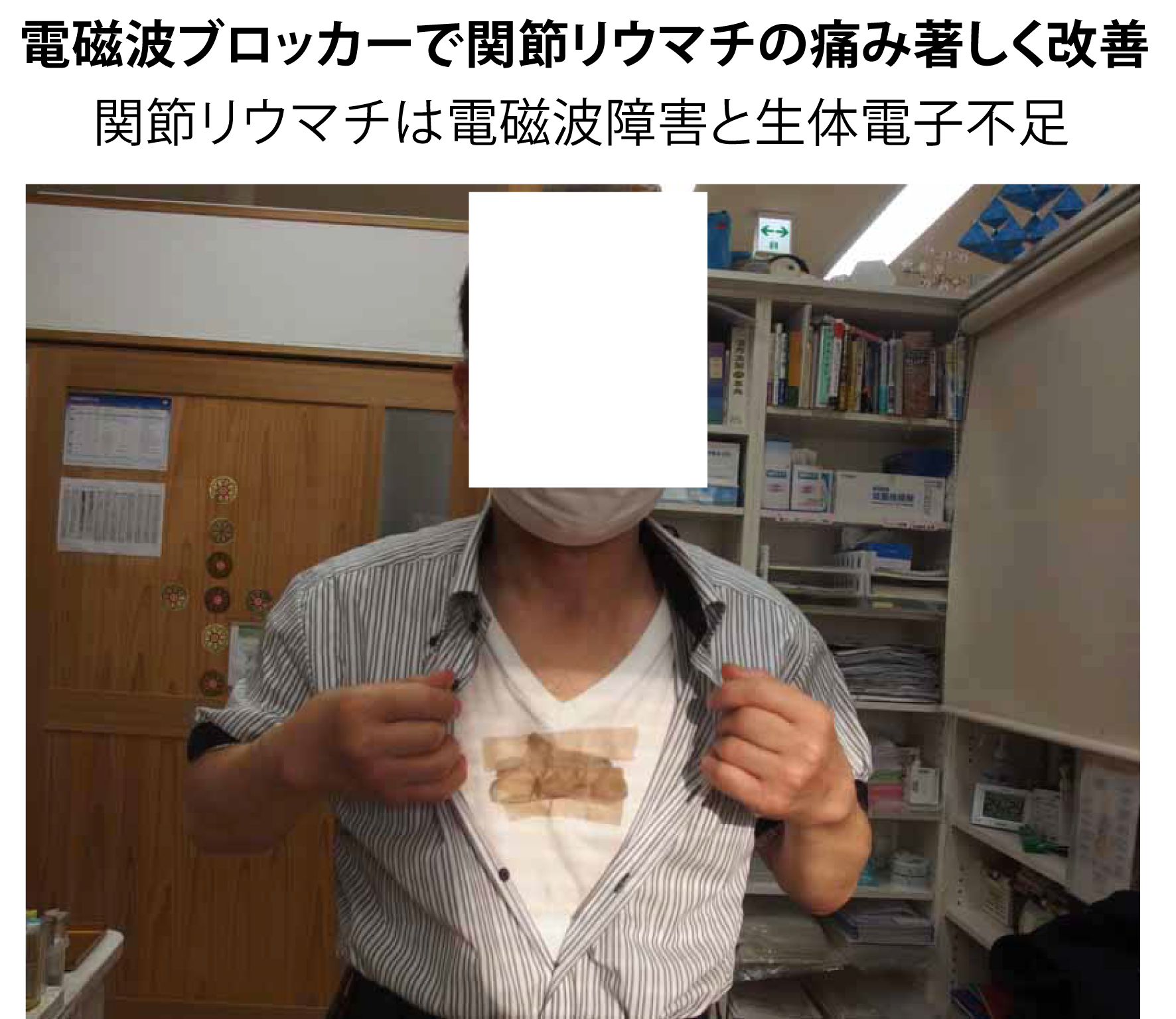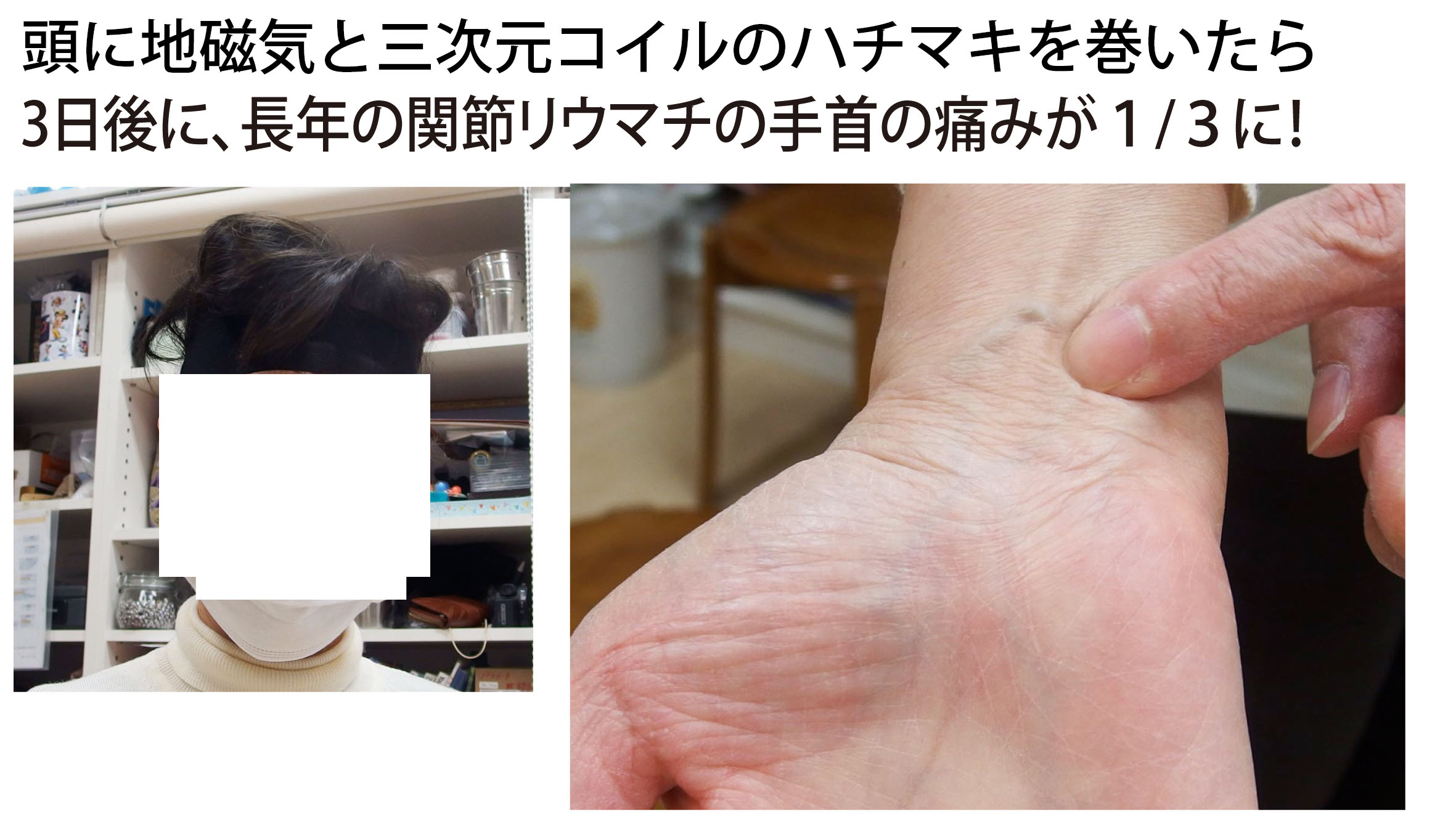 この方は電磁波過敏症の方で、関節リウマチにもかかっていました。そのため、長年手首に痛みがありました。地磁気を発するセラミックスと電磁波をブロックするコイルを頭部に装着したところ、3日後には手首の痛みが3分の1に減りました。そして3か月後には完全に痛みが無くなりました。中等症の関節リウマチの痛みに電磁波が関係することを証明したようなケースでした。 手首の痛みがなぜ頭部の静電気を取り除き、頭部に地磁気と同じ磁気を補ったら良くなったのか疑問に感じる人多いかもしれません。頭部を電磁波的に正常にすることで脳や自律神経系の流れが良くなり、結果的に手の痛みが良くなったと考えています。