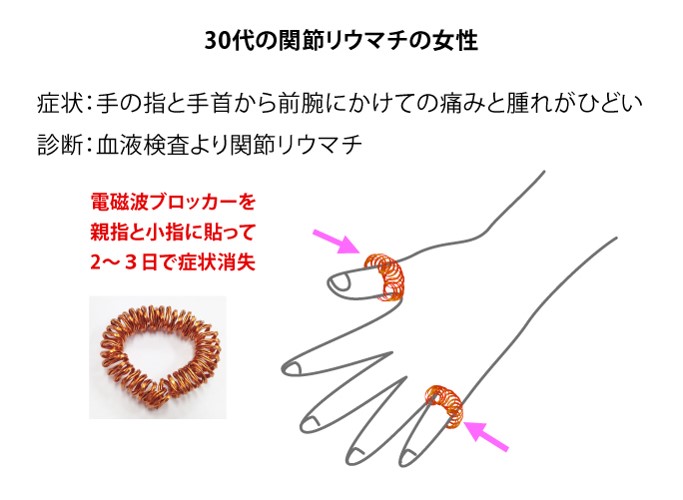32歳の女性は、両手の指と腕の痛みがひどく来院しました。両手の指は、朝方はこわばり腫れるといいます。軽症の関節リウマチは患部に静電気が溜まることや、携帯電話などから出る電磁波が影響して発症することがあるので、電磁波ブロッカーを親指と小指にはめてもらいました。すると30分ほどして痛みが消えたのです。彼女はその後も指に電磁波ブロッカーをはめつづけて1年ぐらいでそれっきり関節リウマチの症状が消滅してしまいました。