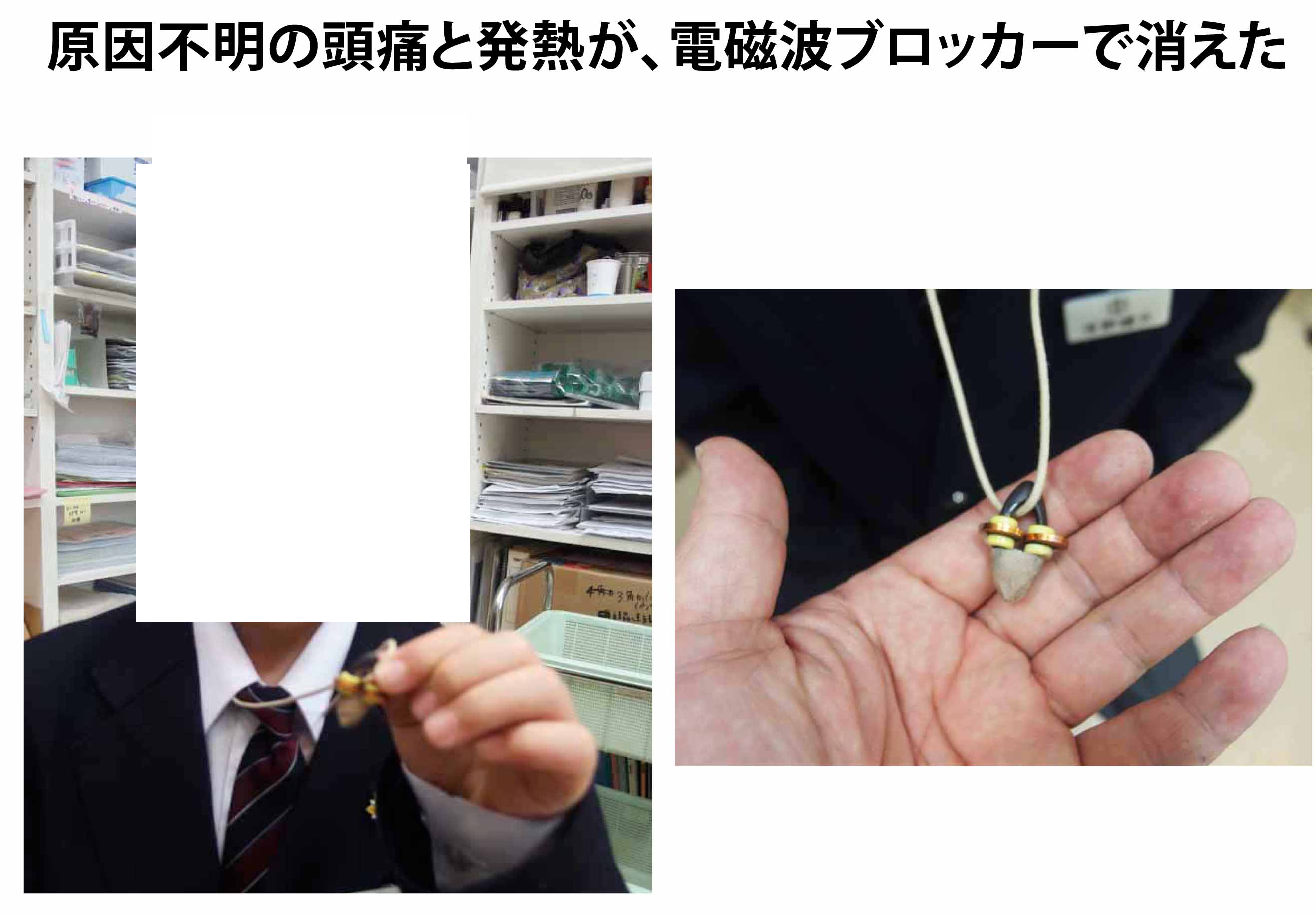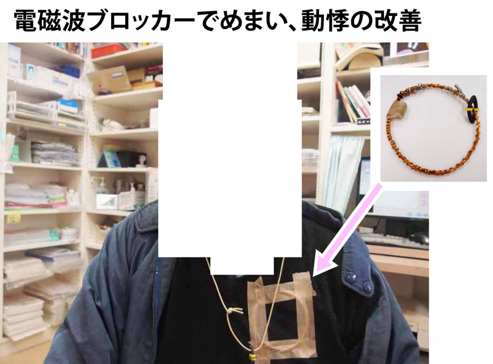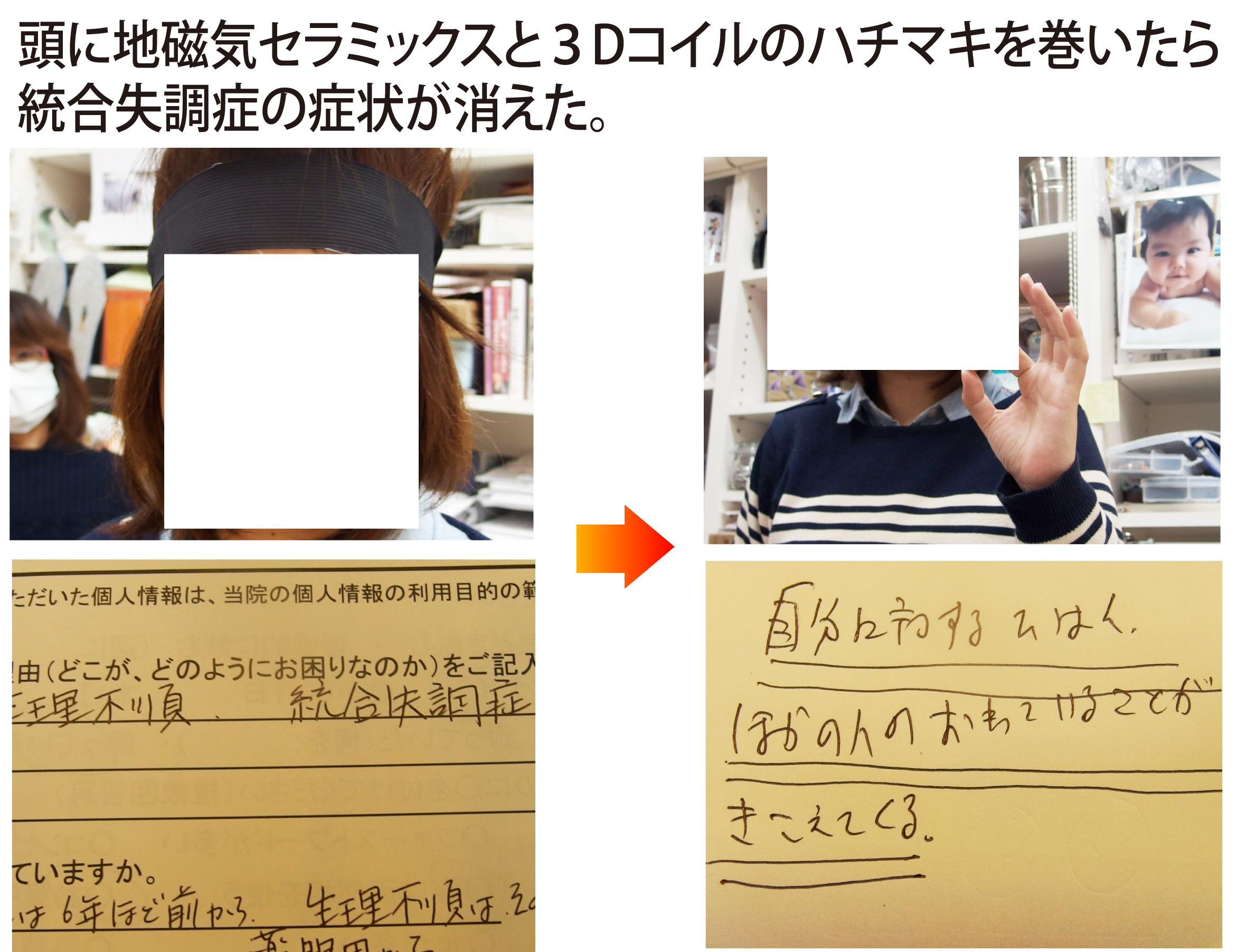 32歳の女性は、統合失調症と診断され、統合失調症の薬を飲んでいます。今回、治療を求めて当院に来られました。彼女は自分に対する他人からの批判が聞こえたり、ほかの人が自分に対して思っていることが聞こえてくる症状があるといいます。磁気の異常と電磁波障害と考え、地磁気を発するセラミックスと電磁波対策用の三次元コイルをはちまきにして額につけてみました。全くよくなるとは思わなかったのですが、30分ほどして彼女は症状が消えてOKサインをしてくれました。2週間後に来院したときには薬も飲まなくてもよくなったそうです。統合失調症が電磁波対策と地磁気の補給でよくなることは少なくありません。