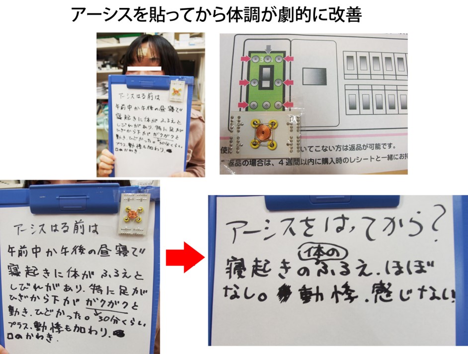 34歳の女性が歩行できないほどのめまいとふらつきで来院しました。一人で歩けないので、夫に抱きかかえられるように診察室に入ってきました。何件もの病院にかかったが原因もわからないし、治療法も無いと言われたそうです。 私は、これは間違いなく電磁波が原因だと考えて彼女の額に炭コイルを貼ってみることにしました。すると、めまいとふらつきはあるものの、数週間ぶりに一人で歩けたのです。少し落ち着いたところで症状を詳しく聞くと、昼寝をした後の寝起きに体の震えと痺れがあり、特に膝から下がガクガクと動き、それが30分くらい止まらずひどい、それに加えて動機、口の渇きもあるということでした。本人に、電磁波障害による症状だと思うと説明し、家の電気コンセントに炭コイルを貼ってもらい、ブレーカーには電磁波をより強力に遮断する器具(アーシス)を貼ってもらったところ、それ以来ほとんどの症状が消えてしまいました。