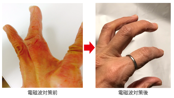 電磁波過敏症の女性で、一旦電磁波対策で良くなったが、口にアンテナとなる金属製の入れ歯を入れたとたん、電磁誘導